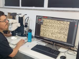 O equipamento é um Estereomicroscópio Leica modelo M205C. Tecnologia Leica Fusion Optics com resolução máxima de 1050 Lp/mm e maior profundidade de foco e com equipamentos de vídeo/fotografia e computador dedicado e software específico para controle do equipamento e tratamento de imagens.